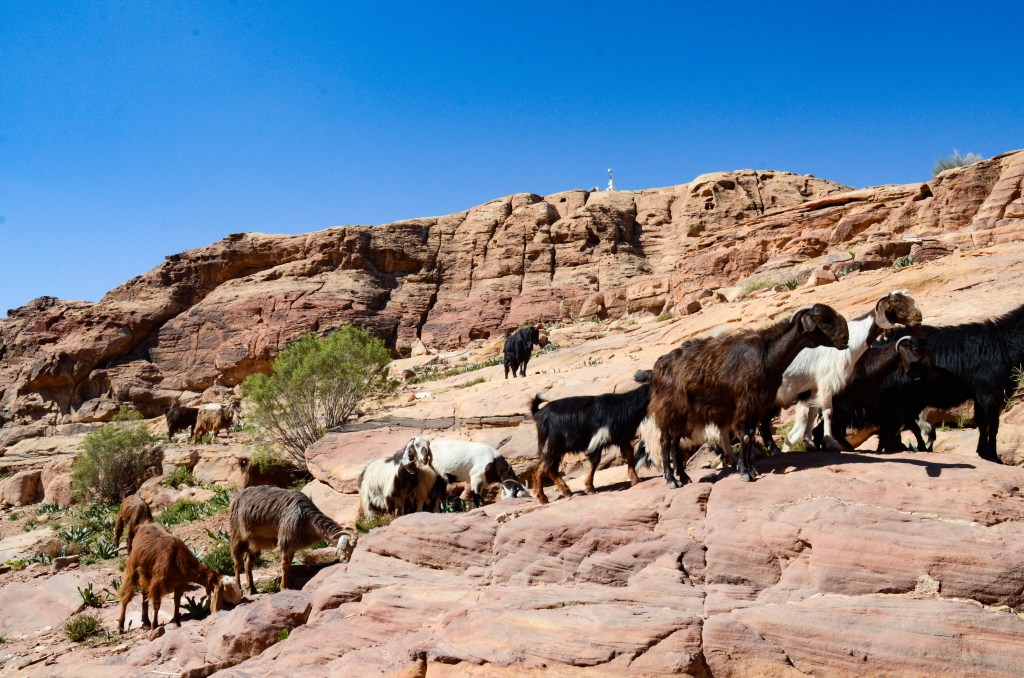 Along the way, we met a herd of goats. We followed them for a while — or they followed us — either way, we hung out for a bit and were impressed by their innate ability to climb the rocky canyons and blend in with the surrounding environment.
