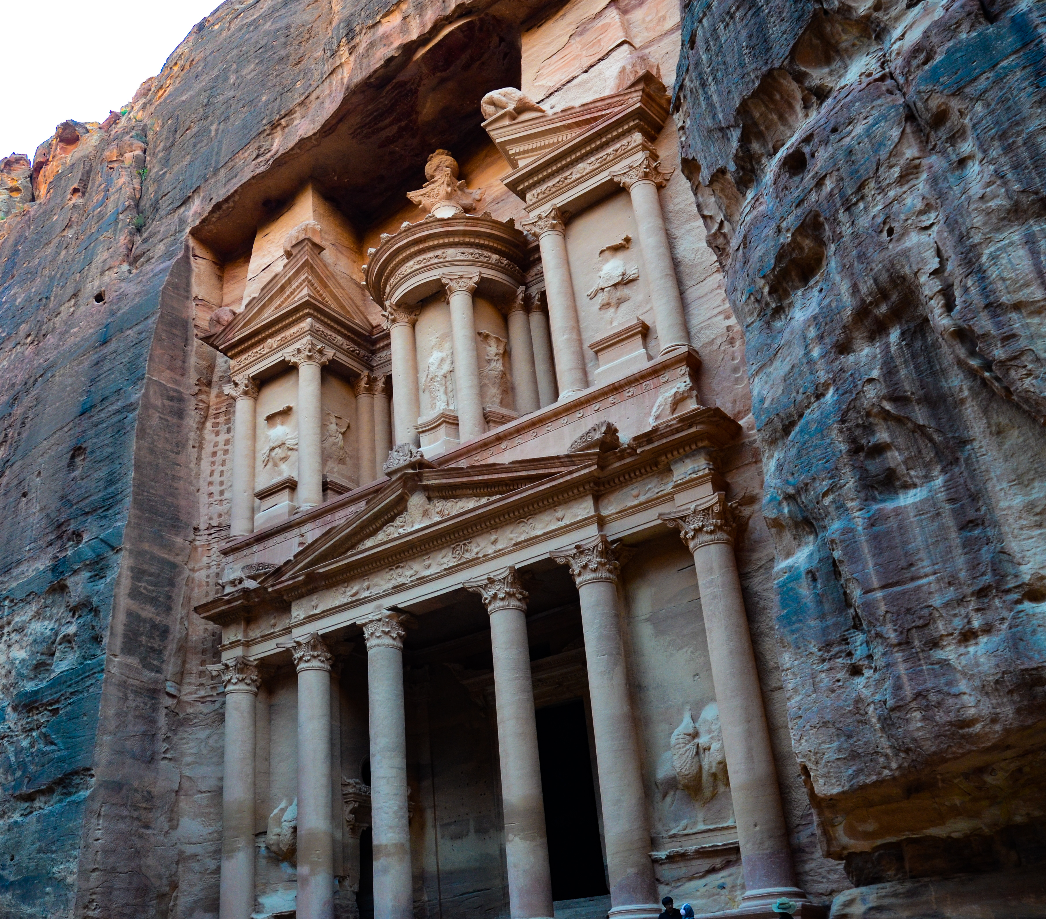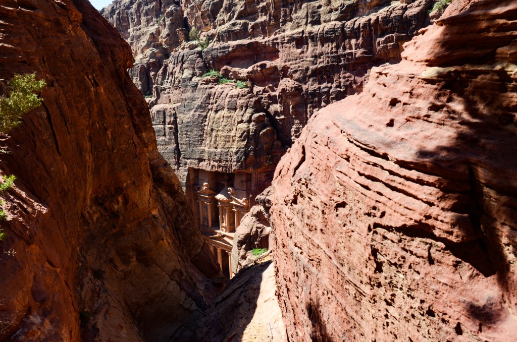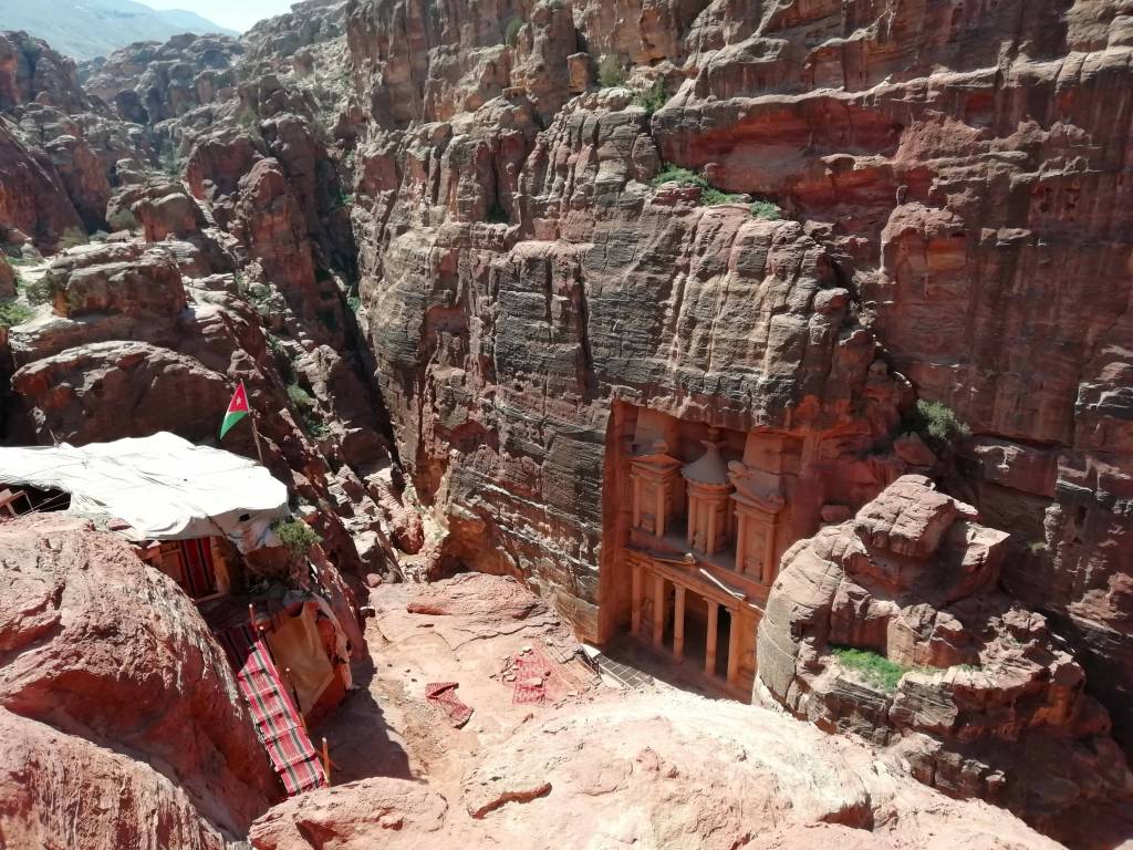 It wasn’t long before we came across a sign leading the way to a viewpoint of the Treasury. At first we couldn’t see it, until we approached a falling olive tree in a crevasse — just past it, we could see the top of the Treasury peeking out through the red rocks. From here, we walked a bit further until we found a small tent with the Jordanian flag. We bought a couple cans of coke in order to sit in the tent and enjoy the view for a bit.
