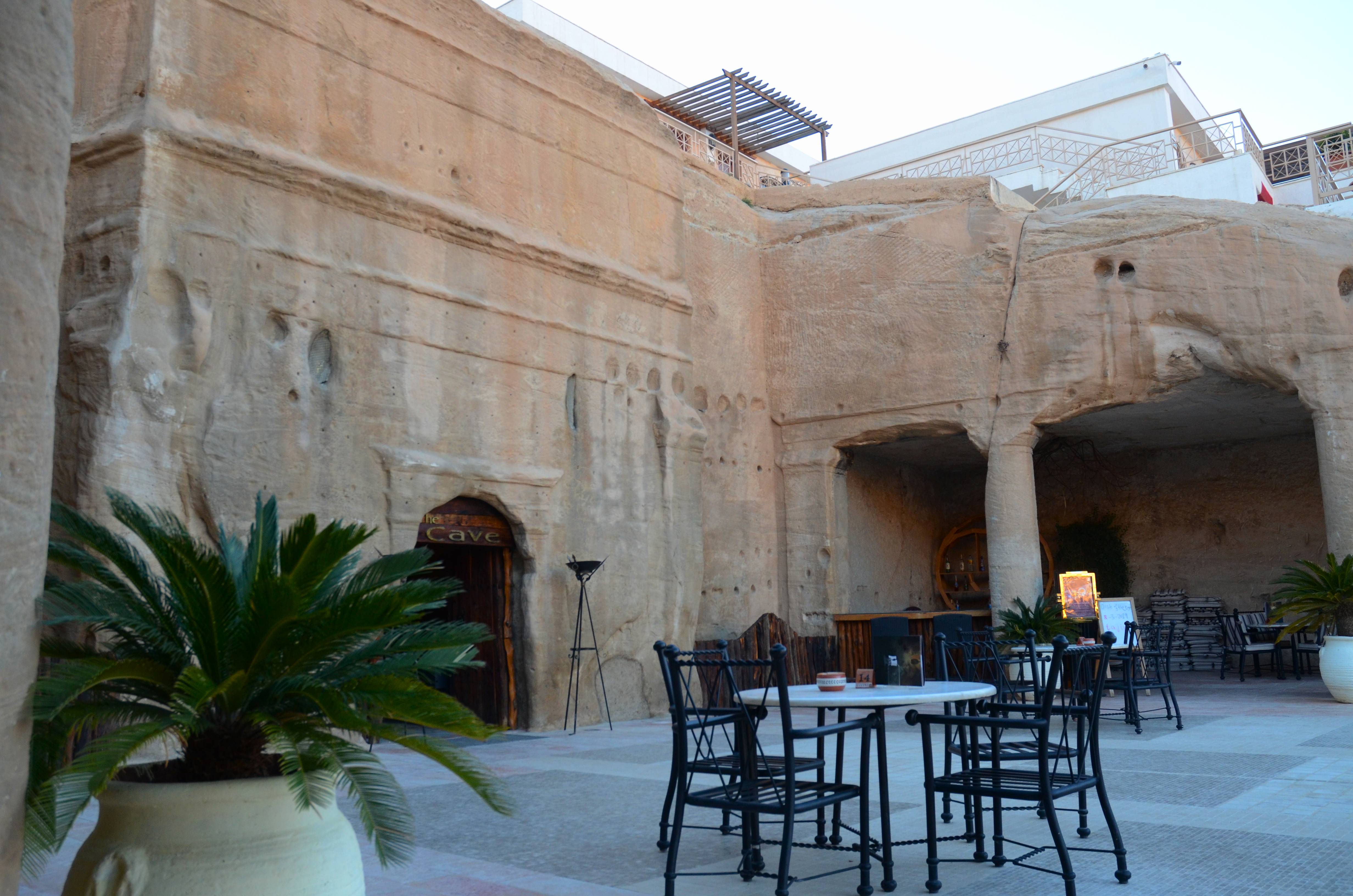 From the Treasury viewpoint, we made our way back down the way we came. At that point in the day, we were completely exhausted after exploring all the main sights of Petra. We decided to head out and relax at the famous Cave Bar just outside of Petra. The bar sits in a 2,000 year-old Nabatean tomb, and the interior looks just like that of the Treasury or Monastery. We sat outside enjoying the cool evening breeze while we sipped on ice cold Petra Beer — which was actually pretty good!